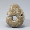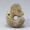 A jade figure carved as a coiled mythical animal with a huge head and exaggerated facial features. The wrinkled snout is above the flared nostrils. The neck is drilled for suspension, and a slit is between the snout and tail. Round rolling, heavy, powerful lines give a charismatic atmosphere that represents Hongshan culture.