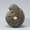 A jade figure carved as a coiled mythical animal with a huge head and exaggerated facial features. The wrinkled snout is above the flared nostrils. The neck is drilled for suspension, and a slit is between the snout and tail. Round rolling, heavy, powerful lines give a charismatic atmosphere that represents Hongshan culture.