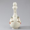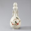 북송 정요(定窑)에서 제작된 것으로 구연부가 작고 목이 가늘고 길며 호리병 모양처럼 울퉁불퉁하고, 몸체가 둥글게 부풀어 있는 병입니다. 전체적으로 흰색 유약이 칠해져 있으며, 목 양쪽에는 좌우 대칭으로 손잡이가 붙어 있고 몸통에는 빨간색, 초록색, 갈색으로 참새 두 마리가 매화 가지 위에 서 있는 모습이 첩화되어 있습니다.