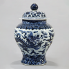 The central body is adorned with auspicious clouds and a vigorously soaring dragon, painted in cobalt blue pigment of a deep, bluish hue.