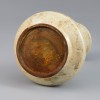 瓶体局部带有冰裂纹,釉面略显粗糙。瓶口外撇,呈平坦宽阔的碟状;细长的颈部饰有凸起的线条,仿若竹节。肩部逐渐展开,至腹部呈扁圆形,腹部侧面以起伏的曲线表现立体感。下腹部微内收,至底足外撇。此件作品属于北宋时期的稀有器物,保留了当时作为随葬品的痕迹,并且在形态及各方面展现其珍贵性。