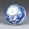 碗内以斗彩绘草虫图,外壁以青花绘两条在繁茂盛开的寿桃间飞舞的龙。