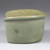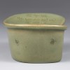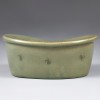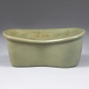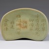 This oval-shaped celadon pillow features an inscription of a poem by the Southern and Northern Dynasties poet Xiao Zixian on the upper surface.