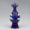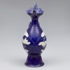 This ewer, fully coated with a deep blue glaze, features a delicately incised lotus motif on its bulbous body. The form exhibits a harmonious balance with its wide flaring mouth, slender neck, rounded belly, and high trapezoidal foot, creating a sense of stability and elegance. The lid is shaped like a phoenix's head, vividly capturing the mythical bird’s prominent crest and upward-curving beak, which exudes dynamism and vitality.