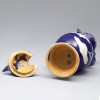 전체적으로 남색 유약이 시유되어 있으며, 복부에는 연꽃 무늬가 음각으로 새겨진 주자입니다. 넓은 구연부와 수축된 목, 부푼 복부, 사다리꼴 모양의 높은 굽이 어우러져 안정감 있는 형태를 이루고 있습니다.