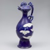执壶通体施蓝釉,腹部阴刻莲纹。宽口沿、束颈、鼓腹以及梯形高足,使整体器型更显端庄稳重。壶盖为凤首形状,其冠羽高耸,喙向上翘。