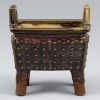 该香炉方形口,两侧对称置方形耳,腹部的四面密密麻麻地雕刻圆形立体的鼓钉纹样。鼓钉纹样形象地表现了谷物萌芽的样子,是象征丰收和万物生机的装饰图案。这些图案蕴含了古人对丰盈谷物和太平盛世的殷切期望,不仅具有艺术美感,也有历史和文化象征意义。