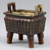 This incense burner features a square rim with upright, symmetrical rectangular handles. Its body is adorned on all four sides with densely arranged, round, raised boss motifs (鼓钉纹). These boss patterns are derived from depictions of sprouting grains, symbolizing vitality and the hope for a bountiful harvest. The motifs reflect the ancient belief in prosperity, the awakening of nature, and the well-being of the nation. They embody a wish for peace and comfort for the people, making this incense burner not only an object of artistic beauty but also a vessel rich in historical and cultural significance.