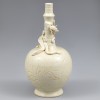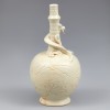 净瓶颈部有轮状出沿,长颈,颈下圆鼓腹,颈上阴刻线纹,规则环绕瓶身。颈肩处堆塑一条螭龙,雕刻工艺精致,龙身缠绕修长的瓶颈,姿态生动,目光向上凝视。螭龙是古代神话传说中的一种龙,象征美好、祥瑞、财富以及爱。