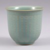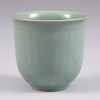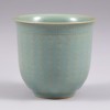The entire cup is coated with a translucent celadon glaze. The glaze has a soft, matte texture, distinguishing it from more glossy finishes.