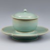 This artwork, produced at the Ru kilns during the Northern Song dynasty (960–1127), consists of a lidded cup paired with a flower-petal-shaped saucer. It is presumed to have been used for holding tea or wine. The piece embodies the refined elegance characteristic of Ru ware, showcasing its serene hues, precise form, and fine surface crackles.