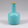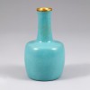 This vase is a ceramic piece produced at the Ru kiln, one of the five great kilns of the Northern Song Dynasty (960–1127). Due to its form—featuring a narrow, elongated neck, sharply angled shoulders, and a stable flat base—it resembles a paper mallet and is thus called a zhichui ping (紙槌瓶), or “paper mallet vase.” The rim is overlaid with gold, referred to as jinkou (金口, “gold mouth”). Vessels with such gold rims are believed to have been used by royalty or aristocrats.