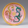 이 유물은 청 옹정 연간에 제작된 접시입니다. 이 접시에는 길상 문양인 용(龍)과 봉황(鳳)이 화려하게 묘사되어 있습니다. 용은 황제를, 봉황은 황후를 상징합니다. 이 두 존재가 함께 있는 형상은 황실의 조화, 번영, 태평성대를 의미합니다. 중심부에는 전서체(篆書體)로 황색의 ‘수(壽)’ 자가 있으며 이는 장수를 기원합니다. 주변에는 다채로운 구름 문양이 용과 봉황을 감싸고 있습니다. ‘壽’자, 용과 봉황, 구름 문양은 각각 장수, 화합, 번영을 상징합니다. 외곽의 황색 연운문(連雲紋)은 황실 도자기의 전형적인 문양입니다.