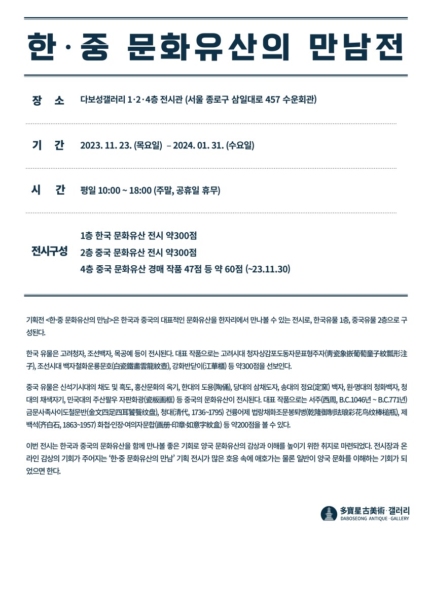 목록 "한ㆍ중 문화유산의 만남전" 안내 페이지 정보 조회수7,354 작성일23-11-22 16:26 본문 "한ㆍ중 문화유산의 만남전" 안내 이전글 제10회 중국 문화유산 온라인 경매 안내 24.11.28 다음글전시·경매 종료 및 운영시간 변경 안내 23.04.06 목록