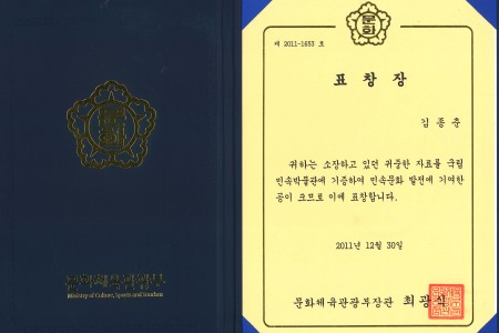 2011년 12월 20일 문화체육관광부장관님께 받은 표창장
