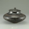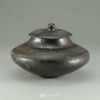 This is a black earthen vessel characterized by a cover, the body of the vessel bulging outwards, and the bottom foot narrower than the mouth.