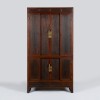이 관복장은 문틀의 구조와 내부 판재 구성이 휨과 뒤틀림을 방지하도록 정밀하게 제작되었습니다. 상하 이단 분할 구조로 구성되어 있으며, 문판은 어두운 색감의 나뭇결이 살아 있어 전체적으로 중후한 인상을 줍니다. 문의 중심에는 금속 장석(裝飾)이 부착되어 있으며, 간결한 형태로 장식성을 절제하면서도 목재 고유의 질감과 조화를 이루는 전통 양식의 미감이 잘 드러납니다. 특히 문이 여닫이와 미닫이로 함께 사용하는 안고지기장으로 제작되었습니다. 또한, 하부 구조에는 다리가 있어 바닥의 습기를 방지하는 실용성을 확보함과 동시에 전체적인 균형미를 이루고 있습니다. 이뿐만 아닌 다리의 하단부에는 특징적인 조각이 있어 미적 요소도 보입니다.