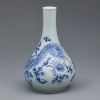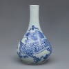 This bottle features a harmonious combination of a long, slender neck and a rounded body that gradually widens toward the base, resulting in a form that appears full and well-balanced. The glaze is a pale bluish white with a subtle luster, giving a calm yet refined impression. On the front of the vessel, a dragon is dynamically depicted amid clouds in blue underglaze, appearing as if it is tearing through the sky. The dragon’s gleaming eyes and powerfully coiled scales suggest that a painter with exceptional artistic skill contributed to this work.