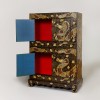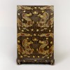 짙은 흑칠 바탕 위에 여의주를 사이에 둔 사조룡들이 시문되어 있습니다. 이러한 구상의 의미는 권위와 길상을 나타냅니다. 바탕에는 구름 문양과 다양한 길상 문양들이 빽빽하게 채워져 화려함을 더합니다. 자개와 바다거북의 껍질인 대모(玳瑁)를 활용하였으며, 당시 대모는 귀한 재료로 여겨져 상류층만이 향유한 유물임을 유추할 수 있습니다. 또한, 문짝 중앙에는 나비형 장석이 부착되어 있으며, ‘만(卍)’ 자 문양이 투각되어 있습니다.