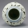 외항아리의 흙이 마르기 전에 문양을 도려내는 투각(透刻) 기법으로 모란당초문을 표현하였습니다. 어깨에는 청화로 당초문대를, 허리 아래에는 양각 기법으로 여의두문과 대선을 둘러 장식했습니다. 모란은 부귀와 번영, 당초문은 생명력과 연속성, 여의두문은 성취를 상징합니다.