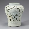 This jar, produced in the 18th century at the Bunwon kiln in Gwangju, Korea, is a fine example of a white porcelain blue-and-white reticulated vessel from the Joseon Dynasty. It features a straight, upright rim, a broad shoulder that flares outwards, and a body that gradually narrows toward the base. The structure consists of two layers, an inner and an outer jar fitted together as one form.