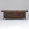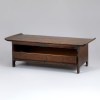 This particular desk has slightly upturned ends on the top board to prevent objects from slipping off. The long drawer is ideal for storing writing tools such as brushes, inkstones, and paper. At the center is a circular metal lockplate, while ring-shaped handles are attached on both sides. Metal fittings at the corners add both strength and elegance.