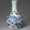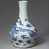 조선시대에 제작된 운룡문(雲龍紋) 청화백자 병입니다. 긴 목 아래에서 어깨가 팽창된 뒤 점차 좁아지는 형태이며, 굽은 안굽으로 깎여 있고 바닥은 편평합니다.