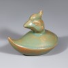 여요 특유의 은은한 비색 유약이 시유되어 표면은 잔잔한 광택을 띱니다. 부분적으로 미세한 빙렬과 유약층의 두께 변화가 나타나 자연스러운 질감을 보여줍니다. 유물 표면의 황갈색 갈변 흔적은 장기간 매장되어 생긴 것으로 보여 연적이 실사용되었는지와는 무관하게 부장품으로 추정됩니다. 굽 안쪽에는 규석을 받쳐 구운 흔적이 세 군데 있습니다.