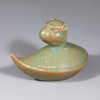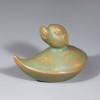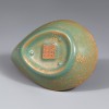 通体施以汝窑特有的淡雅天青釉,釉面柔和而富有微光。局部可见细密的开片及釉层厚薄的自然变化,呈现出温润的质感。器表略带黄褐色的土沁,应为长时期埋藏所致,由此推测其作为随葬明器,与实际使用的砚滴无关。器底内侧可见三处以石英支钉支烧的痕迹。