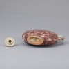 원나라 황제나 귀족의 고분에 있던 부장품인 '명기(明器)'로 추정되는 유리홍 단봉문 편주자입니다. 납작한 원형의 몸체 좌우에 봉황 머리 모양의 출수구와 손잡이가 붙어 있고, 위아래로 연봉 모양의 뚜껑이 있는 입수구(구연부)와 장방형의 굽이 붙어 있습니다. 출수구의 봉황 머리는 몸체의 커다란 날개 무늬로 연결되어 마치 봉황이 하늘을 나는 듯한 인상을 줍니다. 봉황은 태평성대에 나타나는 상서로운 상상의 동물로서 천자(天子)를 상징하며, 하부에 그려진 모란은 꽃이 크고 풍성해 부귀영화를 나타냅니다.