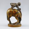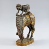 此器物描绘马与猴子。低头站立的马背上,一只猴子以四肢攀附其上。猴子的表情与姿态生动传神,马的鬃毛与猴子的毛发刻画细致,具有高度写实性。马身以金箔嵌四字铭文与旋涡纹样,装饰华丽而庄重。