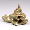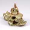 This is a Yuan-dynasty Longquan ware ceramic figure depicting Avalokiteshvara seated on a scholar’s rock. The figure wears a crown adorned with a small transformed Buddha. The head is slightly inclined, with the gaze directed downward. The right knee is raised with the right arm resting on it, while the left hand is placed behind on the ground. This posture is known as the “royal ease pose,” derived from the seated posture of a cakravartin. The drapery and ornaments are rendered in fine low relief.