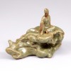 관음보살이 괴석 위에 앉아 있는 형상의 원 용천요(龍泉窯) 도자입니다. 머리에는 작은 화불(化佛)이 표현된 보관(寶冠)을 쓰고 있습니다. 고개를 약간 숙이고 시선은 아래를 향하고 있습니다. 오른쪽 무릎을 세우고 그 위에 오른팔을 올려놓은 자세이며, 왼손은 뒤로 바닥을 짚고 있습니다. 이러한 자세는 전륜성왕(轉輪聖王)의 좌법에서 유래한 윤왕좌(輪王坐)로 알려져 있습니다. 의문과 영락은 미세한 양각으로 표현되어 있습니다.