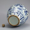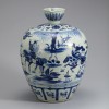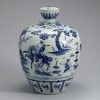 At the center of the body, a scene depicting three generals in combat, known as the Three Famous Generals motif, is painted in deep cobalt blue. Each general is shown mounted on horseback, dynamically pursuing one another. The figures represent Liu Wuzhou of Dingyang, Wang Shichong of Luoyang, and Li Yuan of Taiyuan, historical figures who appeared during the late Sui dynasty (581–619). Banana-leaf motifs decorate the rim, while the shoulder is adorned with baoxianghua (precious floral) designs.