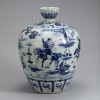 몸체 중앙에는 발색이 짙은 청화로 세 명의 장수가 전투하는 장면인 삼명장문(三名將紋)이 시문되었습니다. 세 장수가 각각 말을 타고 서로 쫓고 쫓기는 모습을 역동적으로 묘사하였습니다. 세 장수는 정양(定陽)의 유무주(劉武周), 낙양(洛陽)의 왕세충(王世充), 태원(太原)의 이연(李淵)을 가리킵니다. 이들은 수나라(隋, 581~619) 말기에 등장하였던 인물들입니다. 구연부에는 파초 문양이, 어깨에는 보상화(寶相花) 문양이 그려져 있습니다.