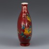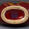 抱月瓶以红釉为底,其上绘象征长寿的桃树和寓意吉祥的蝙蝠。