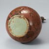 器物通体施以青瓷釉,经过素烧后在局部绘施氧化铜颜料,再罩釉高温烧成。烧制过程中产生窑变效果,使器表呈现出自然的起伏肌理与丰富的色调变化。釉面泛出柔和而内敛的光泽,质感细腻。足底与器内未施红彩,保留了青瓷釉本色;足底可见垫烧所用耐火土的痕迹。