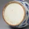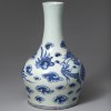 조선시대에 제작된 운룡문(雲龍紋) 청화백자 병입니다. 긴 목 아래에서 어깨가 팽창된 뒤 점차 좁아지는 형태이며, 굽은 안굽으로 깎여 있고 바닥은 편평합니다.